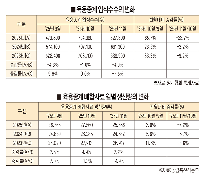 11월 육용종계 배합사료는 2만5천톤으로 전년동월대비 3.2% 증가한 물량이 공급되었다(전년동월 2만4천톤). 종계사료 증가는 AI 및 2026년 전반기 종란 생산확대를 위해 생산연장이 진행되면서 증가한 것으로 보인다.