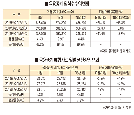 2018년 1월 육용종계 배합사료 생산량은 2만5천160톤으로 전년 동기대비 0.4%감소했지만, 전전년동기 대비는 7.9%증가했다. 육용종계 사료량이 전년과 비슷한 물량이라는 점에서 안심할 수 있으나, 2017년 11월~2018년 1월에는 AI 영향으로 살처분된 종계수수가 약 88만7천수, 환우 및 생산 연장이 약 100만수였던 것을 감안할 경우 평년대비 7%이상 증가한 물량이 생산됐다.