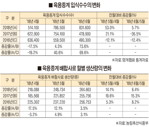 2018년 6월 육계배합사료 생산량이 전년대비 3.5%, 전전년대비 3.1% 증가한 26만4천663톤이 생산되었다. 육계의 사료효율이 소폭 개선된 것을 감안할 경우 7월 육계 생산량은 전년대비 5~8% 증가했을 것으로 예상된다.