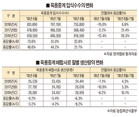 2017년 환우계군 증가와 종계의 생산에 가담한 주령이 노후 계군임을 감안, ’18년 5~6월 병아리 과잉공급을 우려 조기 환우에 들어간 계군들이 8월부터 생산에 가담됐고, ’18년 종계생산성이 10%~15% 개선된 점을 감안할 경우 감소한 종계의 사료생산량과 별개로 하반기 병아리 공급은 과잉으로 예측되고 있다.