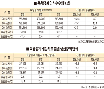 2016년 7월 육용종계는 51만3천500수가 입식되어 전년동기 대비 27.7% 감소, 전전년동기 대비 4.1% 증가했다.(자료참고 : 육용종계 입식수수의 변화)