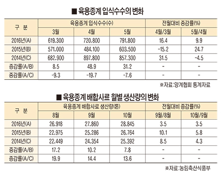 2016년 10월 육용종계 배합사료 생산량은 2만8천845톤으로 전년동기 대비 7.8% 증가, 전전년동기 대비 13.6% 증가했다.(자료참고 : 육용종계 배합사료 월별 생산량의 변화) 10월 실적은 역대 최고치를 경신하는 수치로 종계의 지연 도태가 상당히 심각한 수준임을 보여 주고 있다.