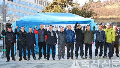 농성 둘쨋날 대한한돈협회(회장 하태식)와 한국오리협회(회장 김병은)가, 셋쨋날 전국한우협회(회장 김홍길)와 한국사슴협회(회장 서종구)가 각각 자리를 지킨 농성장으로 발길을 옮긴 양축농가들은 최강의 한파속에도 무허가축사 적법화 대책을 반드시 관철시키겠다는 의지를 굽히지 않고 있는 축산단체장과 관계자들을 격려했다.
