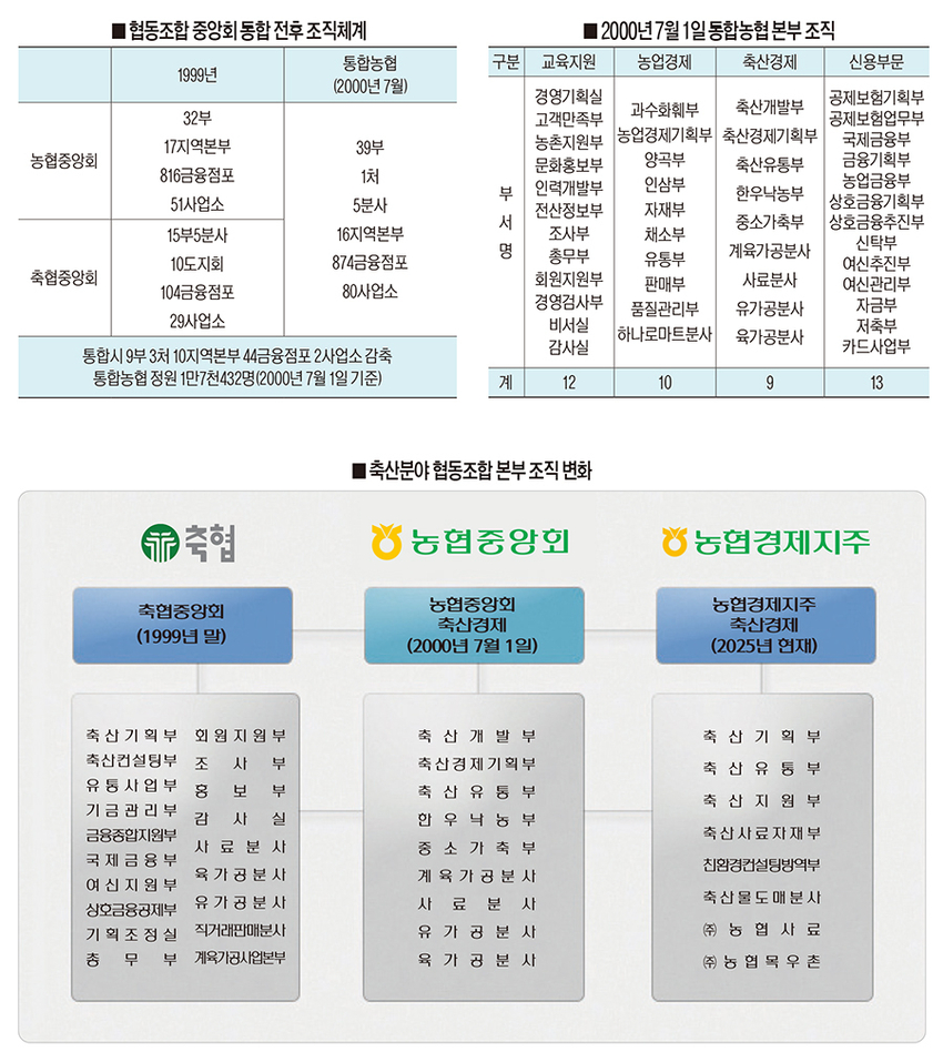 통합농협 출범으로 축협중앙회는 경제사업을 중심으로 하는 농협중앙회 내에 ‘축산경제’ 조직으로 변화됐다. 농축협은 통합으로 조직적 측면에서는 슬림화를 부분적으로 이룬 것으로 기억된다. 통합직전 농축협중앙회 기구는 48부 4처 5분사 26지역본부(도지회) 918금융점포 82사업소였다. 이를 통합으로 본부부서 12개, 지역본부 10개, 금융점포 44개, 경제사업장 2개소를 줄여 2000년 7월 1일 통합농협은 39부 1처 5분사 16지역본부 874금융점포 80사업소로 출범했다. 이 과정에서 축협중앙회의 신용사업과 회원관리를 비롯한 지도관리기능이 농협의 교육지원부문과 신용사업부문으로 통합돼 축산경제 부문은 경제사업조직으로 변모했다. 통합으로 농축협을 떠난 임원 및 집행간부는 25명이며 2000년 6월 말 기준으로 4천26명의 축협중앙회 직원 중 909명이 조직을 떠났다. 당시 통합농협에 들어온 축협 직원 3천117명 중 축산경제 조직에 남은 인원은 1천613명에 불과했다.