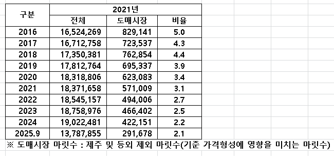 게다가 2016년 5.0%, 2018년 4.4%, 2020년 3.4%, 2022년 2.7%, 2024년 2.2% 등으로 점점 감소세다. 이대로 가다가는 2%대도 무너질 수 있다. 지난 2000년 도매시장 출하 물량 비중 27%는 ‘옛 영광’이 돼버렸다.