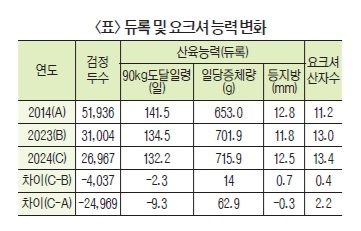 이는 전년인 2023년과 비교해 90kg 도달일령은 2.3일이 빨라지고, 일당증체량은 14g이 증가한 것이다. 등지방은 0.7mm 두꺼워졌다.