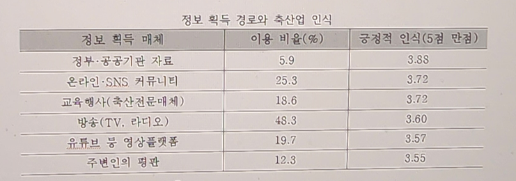 가장 높은 수준으로 긍정적 인식을 보인 집단은 ‘정부·공공기관 자료’(평균 3.88점)였고, ‘온라인·SNS 커뮤니티’와 ‘축산 전문 매체 교육행사’가 각각 3.72점으로 뒤를 이었다.