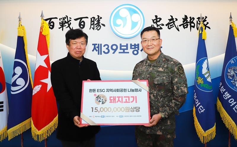 대한한돈협회 경남도협의회(협의회장 주재용)는 지난 12월 24일 연말연시를 맞아 조국 수호에 헌신하는 국군장병을 격려하고 우리 돼지 ‘한돈’의 우수성을 알리고자 1천500만 원 상당의 돼지고기를 39사단에 전달했다.