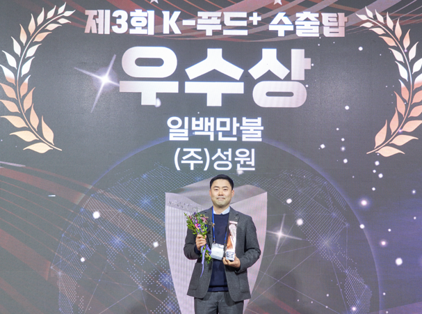 성원은 구랍 23일 서울 양재동에 있는 aT센터에서 열린 제3회 K-푸드 플러스 시상식에서 수출탑을 받았다.