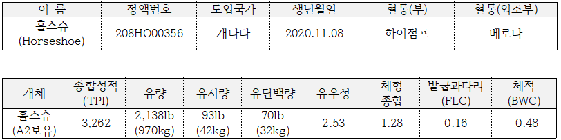 젖소개량사업소가 지난 2023년에 도입한 ‘홀스슈’는 이번에 종합성적(TPI) +3,262로 상위 1% 수준의 우수한 성적을 보였다. 세부 성적을 보면 유량 +2,138, 유지방 +93, 유단백 +70, 체형종합 +1.28, 사료 효율 +287, A2A2 유전형 보유 등 생산성과 체형 모두 균형 잡힌 유전능력을 나타냈다고 한다. 특히 유량과 유지량, 유단백 수치가 우수해 국내 낙농가의 원유 생산성과 수익 향상에 기여할 수 있다는 설명이다.