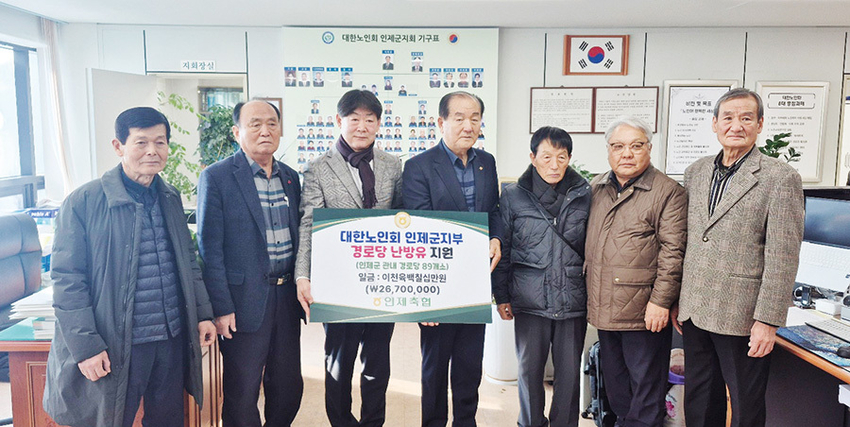 강원 인제축협(조합장 조동환)은 추운 겨울을 맞아 관내 어르신들의 난방 부담을 덜기 위해 지난 구랍 22일, 대한노인회 인제군지회(회장 김양준)를 방문해 관내 마을 경로당 89개소에 2천700만원 상당의 난방유를 지원<사진>했다.