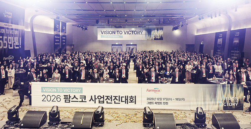 팜스코는 구랍 17·18일 이틀 동안 그랜드 하얏트 인천 그랜드볼룸에서 대리점 사장단과 팜스코 임직원, 그 가족들까지 340여명이 참석한 가운데 ‘Vision to Victory’라는 슬로건 아래 ‘2026 팜스코 사업전진대회’<사진>를 갖고, 2026년을 향해 큰 걸음을 내디뎠다.