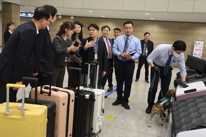 이날 최 본부장은 △화물, 여행객 휴대품 등에 대한 검역 절차 △검역 엑스레이(X-ray) 판독 △검역탐지견 운영 △축산관계자 소독·교육 △의심물품 적발 △후속조치 체계 등 현장업무를 면밀히 살폈다.