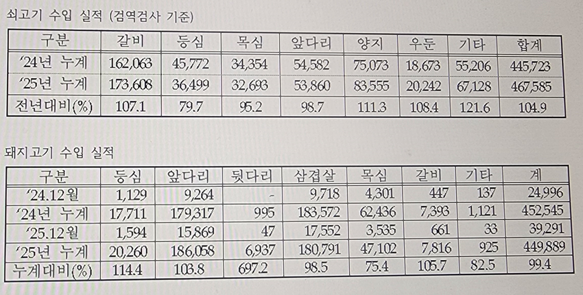 한국육류유통수출협회(회장 김용철) 분석에 따르면 쇠고기는 지난해(2025년) 총 46만7천600톤(검역검사 기준)이 수입됐다.