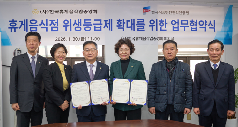 한국식품안전관리인증원(원장 한상배)은 지난 1월 30일 한국휴게음식업중앙회(회장 조영순)와 업무협약(MOU)을 맺고, 식품안심업소(위생등급 지정업소) 확대에 힘을 모으기로 했다.