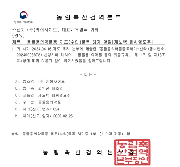 케어사이드(대표 유영국)는 지난 2월 25일 써코·마이코 혼합백신 ‘제노백 피씨엠포주(Xenovax PCM4)’에 대해 농림축산검역본부로부터 정식 품목허가를 받았다.