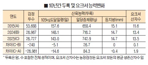 지난 2025년 한해 105kg 도달일령이 전년 보다 5.1일 단축됐을 뿐 만 아니라 일당증체량은 26.7g이 늘어났다. 특히 요크셔 산자수는 0.1두 증가한 것으로 분석됐다.