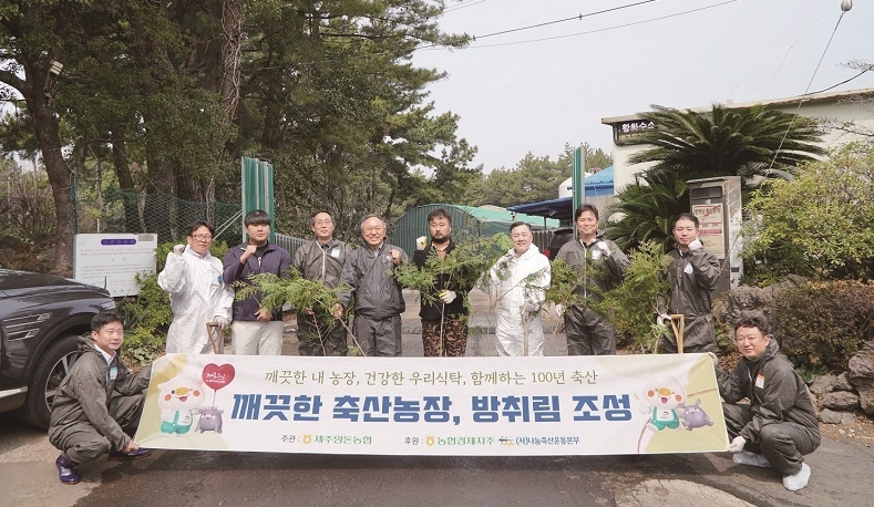 제주양돈농협(조합장 고권진)은 지난 3월 27일 서귀포시 회수동에 위치한 대우축산(대표 송호섭)에서 ‘깨끗한 축산농장 방취림 조성사업’ 식재행사<사진>를 개최했다.