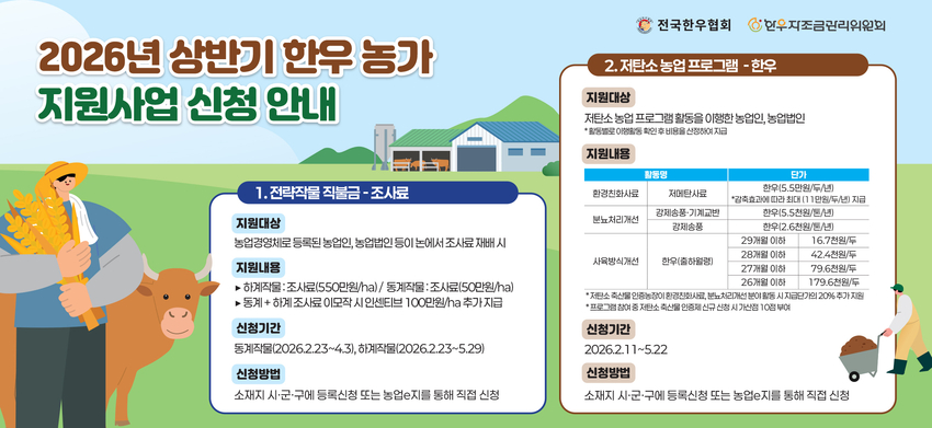 올해 상반기 한우농가를 대상으로 한 주요 지원사업 신청이 시작됐다. 농가들의 적극적인 참여가 요구되된다. 조사료 생산 확대와 저탄소 사육 전환을 유도하는 이번 사업들은 농가 경영 부담 완화와 경쟁력 제고에 초점이 맞춰졌다.