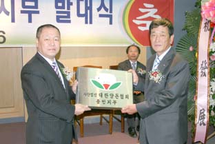 - 양돈협회 김동환 회장<사진 왼쪽>이 김건호 경기도협의회장이 지켜보는 가운데 박준원 지부장에게 현판을 전달하고 있다.