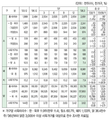한우와 양계 사육 마리수는 증가한 반면 육우·젖소와 돼지 사육 마리수는 감소한 것으로 나타났다. /표 참조 통계청이 3월 1일 현재 가축사육통계 조사 결과에 따르면 한·육우의 경우 산지가격 안정, 미국산 수입 쇠고기 검역 중단 등으로 사육마리수가 전분기보다 4만두, 전년동기보다 19만8천두 늘어난 2백24만1천두로 집계됐다. 젖소의 경우는 원유 생산 쿼터제 지속 추진 등으로 가임암소가 감소하여 사육두수는 전분기보다 3천두, 전년동기보다 1만1천두 감소한 45만두로 나타났다. 돼지는 배합사료 가격 인상 등 농가의 경영이 악화되어 사육 두수는 전분기보다 62만5천두, 전년동기보다는 36만4천두 감소한 8백98만1천두로 나타났다. 닭은 가격 호조 및 봄철 수요 증가 기대로 산란계의 경우 전분기보다 1백75만7천마리 증가한 5천7백85만마리, 육계는 전분기보다 1천78만6천마리 증가한 6천7백1만3천수로 나타났다. ■한·육우=한·육우 사육마리수는 2백24만1천마리로 이중 한우는 2백8만3천마리. 이는 전분기보다 4만9천마리(2.4%), 전년동기보다 21만2천마리(11.3%)로 늘어난 규모이다. 육우는 15만8천마리로 전분기 9천마리(-5.4%), 전년동기보다 1만4천마리(-8.1%) 감소한 규모. 가임암소는 97만4천두로 전분기보다 3만3천마리(3.5%), 전년동기보다 8만4천마리(9.4%) 증가했다. 사육가구수는 18만8천호로 전분기보다 4천호(2.2%) 증가한 반면 전년동기보다 2천호(1.1%) 감소했다. 호당 사육마리수는 11.9두로 전분기와 같으나 전년동기보다는 1.1두 증가했다. ■젖소=젖소 사육마리수는 가임암소 감소에 따라 전분기보다 3천두(0.7%), 전년동기보다 1만1천두(2.4%) 감소한 45만두. 사육가구수는 7천4백호로 전분기보다 3백호(-3.9%), 전년동기보다 7백호(-8.6%) 각각 줄었다. 호당 사육마리수는 60.7두로 전분기보다 1.5두, 전년동기보다 4.1두로 늘어나 꾸준한 규모화 추세를 보이고 있다. ■돼지=돼지 사육마리수는 전분기보다 62만5천두(-6.5%), 전년동기보다도 36만4천두(-3.9%) 각각 감소한 8백98만1천두. 이중 모돈 마리수도 93만6천두로 전분기 6만8천두(-6.8%), 전년동기보다 7만두(-7.0) 각각 줄었다. 사육가구수는 7천9백호로 전분기보다 1천9백호(-19.4%), 전년동기보다 2천9백호(-26.9%) 각각 줄었다. 호당 사육마리수는 1천1백33두로 전분기보다 1백56두, 전년동기보다 2백65두 늘어났다. ■닭=닭 사육마리수는 총 1천3백17만8천마리. 이중 산란계는 전분기보다 1백76만수(3.1%) 증가한 5천7백85만수, 육계는 전분기보다 1천79만수(19.2%) 증가한 6천7백1만수. 닭 사육가구수는 3천6백22호로 전분기보다 2백2호(5.9%) 증가한 반면 전년동기보다는 1백호(-2.7%) 줄었다. 호당 사육마리수는 산란계 3만2천수, 육계 4만3천수. |