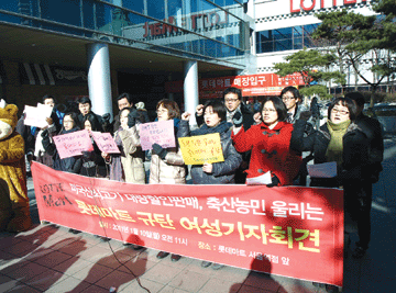 “최소한 기업윤리 마저 망각한 롯데마트는 각성하라.” 롯데마트의 미산 쇠고기 할인판매 파장이 점점 확산되고 있다. 가뜩이나 구제역으로 고조돼 있는 농가들의 심기를 건드리면서 한우협회가 다른 어느 때보다 강력한 대응을 다짐했다. 지난 10일에는 전국여성연대와 한우협회가 공동으로 롯데마트 서울역점 앞에서 기자회견<사진>을 열었다. 강추위 속에서 진행된 이날 기자회견에서 소비자를 대표한 여성단체 관계자들은 롯데마트의 행태에 강한 유감을 표시하면서 불매운동을 통해 그들의 잘못을 응징할 것이라고 밝혔다. 이들은 ‘최소한의 기업윤리 마저 망각한 롯데마트는 각성하라’는 제목의 기자회견문을 통해 롯데마트의 이번 행동은 전국의 축산농가들의 슬픔은 외면한 체 기업의 이익 창출만을 생각한 패륜적 행태라고 규정하고, 즉각적인 사과를 촉구했다. 이날 참석자들은 소비자들을 위한다는 허울을 쓴 롯데마트 측에 거침없는 비난을 퍼부었다. 서울여성회의 관계자는 “싸게 사서 먹을 수 있으면 소비자들에게 좋은 일이지 않느냐는 것이 롯데마트의 논리지만 그것이 누군가의 눈물이고 피와 땀이라면 절대 살로 안 간다”며 “소비자들을 위한다는 말도 안 되는 허울은 벗고 돈과 이익을 위해 하는 짓이라고 인정하라”고 비난했다. 아울러 “롯데마트의 파렴치한 행동은 절대로 용서받을 수 없을 것”이라며 강력한 불매운동 전개를 다짐했다. 또, 다른 참가자는 “내가 서울에 살고, 도시에 산다고 구제역이 남의 일은 아니다. 우리 고향의 일이고, 우리 이웃의 일이다. 그들의 슬픔을 이용해 자신의 이익을 챙기는 기업은 최소한의 윤리도 모르는 사회악” 이라며 “제발 지금이라도 자신의 행동을 반성하길 바란다”고 말했다. 한우협회의 서영석 과장은 “구제역으로 축산농가 모두가 도탄에 빠진 지금 롯데마트의 미산 갈비 할인행사는 차라리 범죄에 가깝다”며 “불과 보름 전까지도 한우자조금의 지원을 받아 소비촉진행사를 진행했던 롯데마트가 갑자기 입장을 바꿔 미산 갈비 판매에 앞장서고 있다는 사실을 절대 받아들일 수 없으며, 협회차원에서의 롯데마트 불매운동을 전개해 나갈 것이다. 아울러 향후 롯데마트와는 어떤 공동행사도 진행하지 않을 것임을 분명히 밝혀둔다”고 말했다. 이날 롯데마트는 당초 계획했던 미산 갈비 할인판매행사를 중단하고, 한우와 한돈의 할인판매행사를 시작했다. |