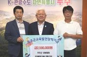 [축산신문 김춘우 기자] 한국양봉협회 무주군지부(지부장 송재철)는 지난 9월 25일 (재)무주군교육발전장학재단(이사장 황인홍 무주군수)에 장학금 259만원을 기탁<사진>해 지역 인재 육성에 힘을 보탰다. 이날 전달한 장학금은 ‘제29회 무주반딧불축제’에서 농특산물 판매장을 운영하면서 얻은 벌꿀 판매 수익금으로 알려져 훈훈함을 더하고 있다. 송재철 지부장은 “지역 대표 축제에서 얻은 수익금인 만큼 의미 있는 일에 쓰고 싶어 회원들이 마음을 모았다”며“양봉협회 회원들이 무주의 청정 환경에서 직접 채취한 고품질 벌꿀을 소개·판매하고 얻은 수익금을 지역사회에 환원한다는 점에서 큰 보람을 느낀다”고 말했다. 그는 이어 “앞으로도 지부 차원에서 지역사회와 함께하는 나눔 활동을 꾸준히 이어갈 것”이라고 덧붙였다. ■무주=김춘우 축산신문, CHUKSANNEWS